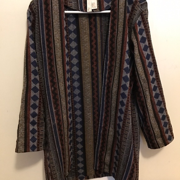Open in the front, thick with a boho pattern- yellow, red, blue, black, and white. No buttons or anything