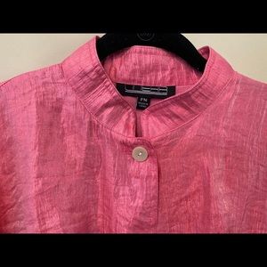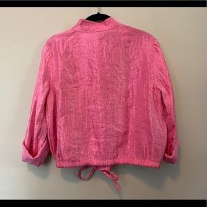 Shimmery pink, light windbreaker like material. Sleeves do unroll. Can cinch tighter are bottom. The way the tag is stitched I can’t really read the brand but I’ve included a picture, I think it says Linear?