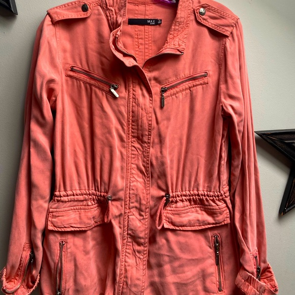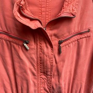 This jacket is perfect for a spring day!! Lightweight, but still keeps you warm and comfy. It’s a red/ pink color, it’s amazing!!