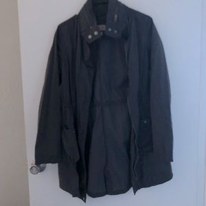 Grey long jacket, hoodie inside zipper.