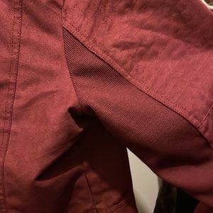 Very soft, light, polyester maroon jacket by Maurices. Zips up at an angle. Stretchy material under the arms.