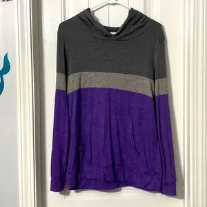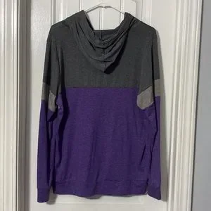 Dark gray, gray, and purple jacket with a hood and a tunnel pocket