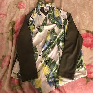 Perfect for fall weather , the front has a leaf detail the back is a solid olive green color as well as the sleeve . Worn very few times in very good condition .