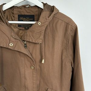 Lightweight brown jacket with gold zipper and gold snap button closures. Hooded. Size smalll only worn a few times- great condition! Smoke free pet free, clean home!