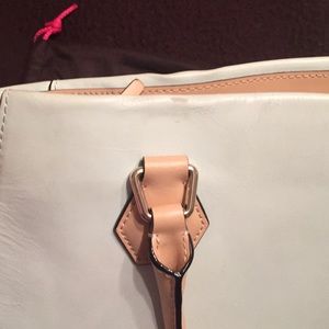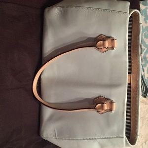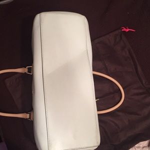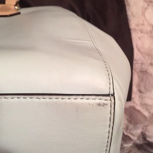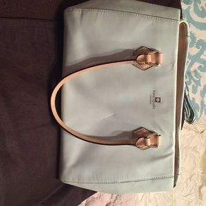 This is a light mint colored large Kate spade bag. Due to the light color you have some small wear spots like the ones pictures above. The inside is in perfect condition and has many pockets. Great spring color! 15.5w X 10 1/4l X 7.5 d