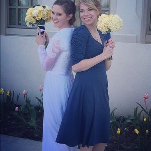 Light navy blue dress. Only worn once for a wedding. Says it's a medium but fits like a small