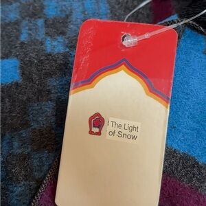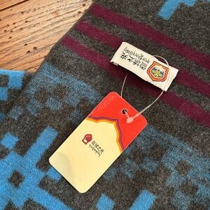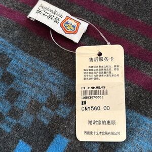 Uber soft Mulberry Silk in a trend-right geometric print featuring charcoal gray, blues and maroon. The brand is Snowlight or the Light of Snow and the edge has a black short fringe. New with tags and in excellent condition.