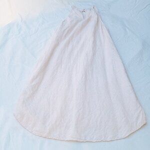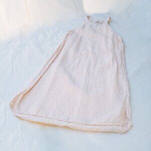 Light pink, 100% linen sundress, halter style with a button in the back to help the high neck style stay put, and shift dress flow. It sits a little longer than a minidress, but still looks cute (and is breathable!) for summer or as a beach coverup.