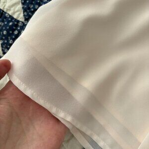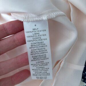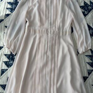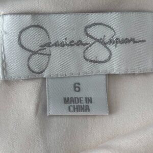 This dress still had the tags on when I went to get it dry-cleaned this week (but they've since been removed by the cleaner). It is a suuuper light pink color (almost imperceptibly pink)! Jessica Simpson brand. Size 6! It would hit at the middle of the thigh, maybe a little higher, for me (I'm 5'9").