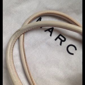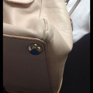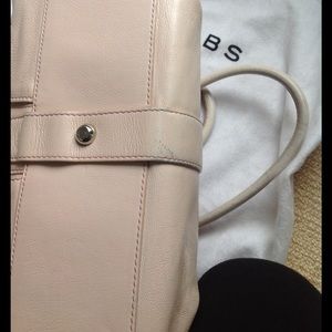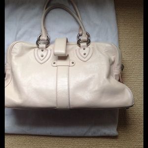 Great for spring light pink Marc Jacobs leather satchel. In good condition. Some wear of leather at bottom corners and at handles. Please see pictures. Minor scuffs to hardware. Inside in very good condition. Small mark to lining seen in pictures