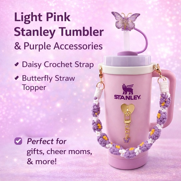 Light Pink Stanley Tumbler w/ Purple Daisy Crochet Strap & Butterfly Straw Topper | Cheer Mom Gift | Cute Accessories