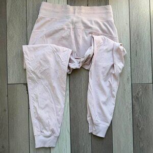 light pink, tapered fit, high waist, knit fabric, elastic cuffs, athleisure, workout wear, gym-ready, streetwear, soft texture