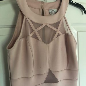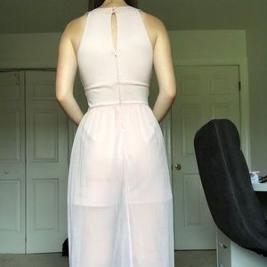 I have worn this romper once and is slightly worn. It is baby pink and is a very comfortable material. There is mesh near the top of the romper. The train is silky and goes down to my ankles. There is a little stain in the left breast area and a small run in one area of the mesh at the top (refer to picture)