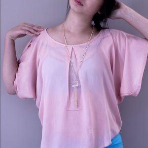 Rose colored top featuring kimono sleeves and a detachable gold necklace with floating stone. Front pleated design on this top.