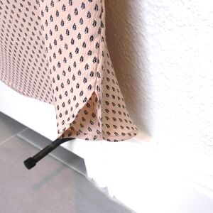 like new sweet light pink short sleeved blouse with small black pattern & cool black piping detail at top of gathered sleeve