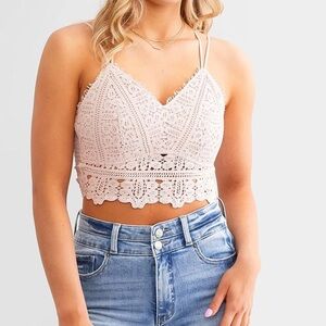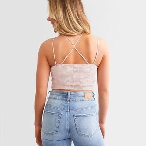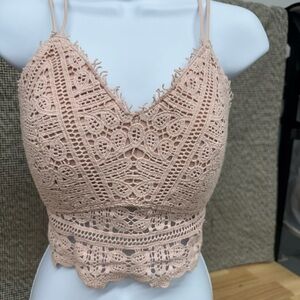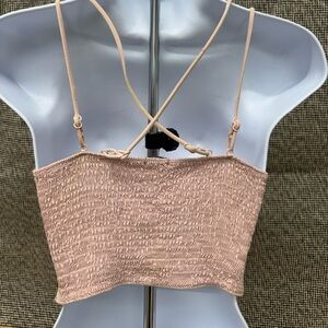 BK Essentials light pink crocheted smocked back bralette/corset. I bought this to wear under a suit coat 1 time, it has built in pads.