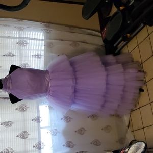Light purple gown. Halter top. The gown has a corset type closure that can be expanded or taken in to fit comfortably. Built in bra pads. Layers of tulle. Satin sash detail at waist. Laid out flat armpit to armpit it is 17in. Armpit to hem it is 40in. Dress is stored inside out and will be shipped in the manner to protect the tulle fabric. Dress will be wrinkled and will need to be hung to help release the wrinkles. Color may vary as pictures were taken with and without flash. Please review all pictures.