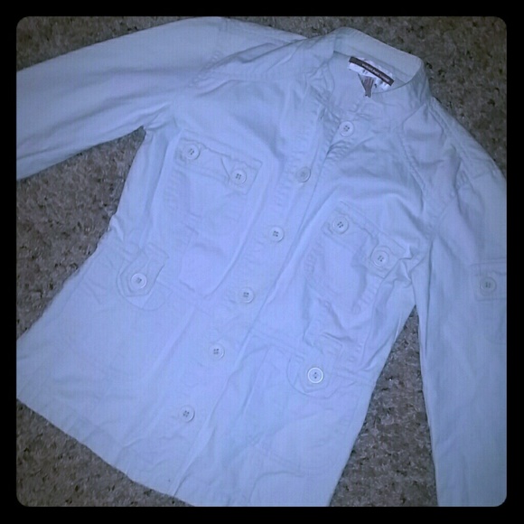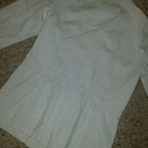 Classy cream colored button up jacket, perfect for spring! Very light! Jacket has side pocket on upper left arm, 4 front pockets with buttons as well. Back of jacket has 2 buttons and pleats. 5 buttons on both arm cuffs. No flaws, or stains. All buttons are intact! 100% cotton