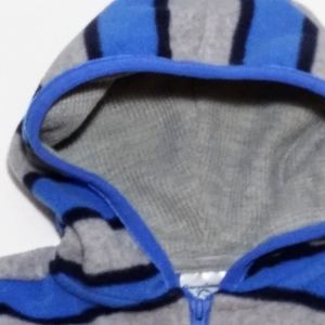 This jacket has a durable zipper, colorful, thermal material in hood, fleece material all over, open cuffs.