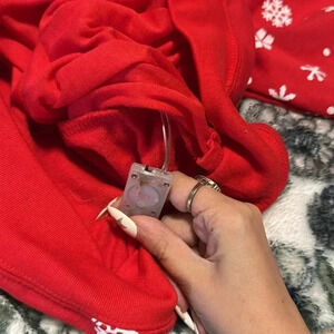 A fun holiday red with an overall snowflake print is the base of this merry little top, find the switch inside the sweater to turn on the lights!! No music is played, this is just the background noise! Unsure of the tune it blinks to, but all five lights blink and strobe! The star of the show, of course is Mickey holding a strand of lights. All the red ones are metallic as well as his body! A size medium, marked a 7/8… I don’t feel that is very accurate as I am a size small and I believe this would be more of a medium fit for a woman. 19 inches across pit to pit. Lengths is 26 inches from him to neck line. Not sure how you would wash this? Very cute and festive for the holidays.