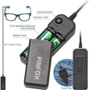 *Glasses work with a battery pack attached by wire ( NOT CORDLESS ). Independent battery pack with two 1.5V AA dry batteries can provide the adequate power to ensure a longer continuous light up time (two hours at least depending on your battary capacity used). The pack and glasses are connected by a 35" wire. You can easily hide the pack in your pocket, clothing or chip in belt by the clip of the pack.
