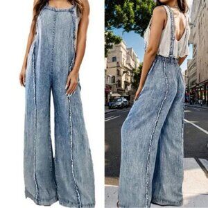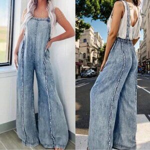 Light wash Denim Frayed Detail wide leg Jumpsuit Overalls