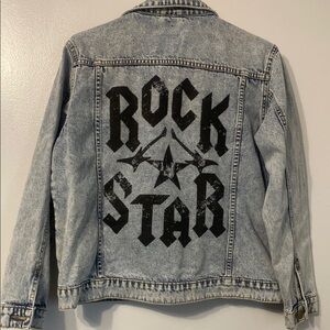 Stylish denim jacket with button details. Features a classic design with front pockets. Has a fun print in the back!