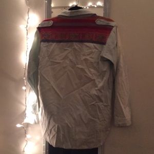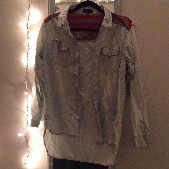 Light wash denim shirt with colorful embroidery on the shoulders from a little boutique in California