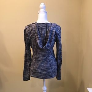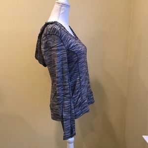 Black and white light weight hoodie long sleeve with thumb holes. V-neck with shirring on each side for a flattering fit.