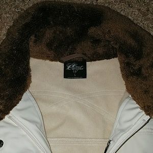 Never worn. Light-weight cream colored jacket with Brown days fur around collar and cuffs. Also, has detachable same for belt.