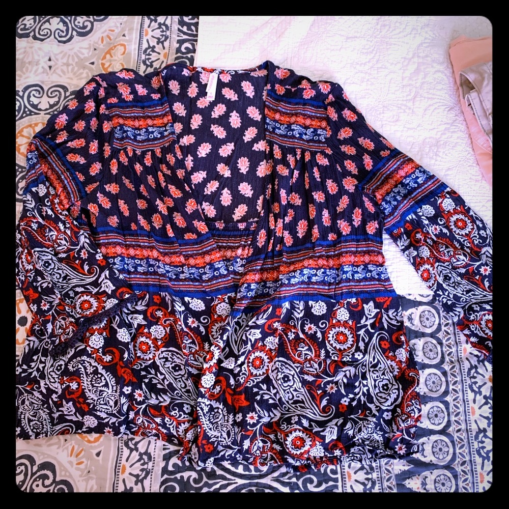 Light weight jacket. Great over a tank top. Red, white and blue paisley.