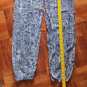 NWOT, never worn (came without tags). Elastic waist about 6"wide, super stretchy, side pocket, elastic cuff no brand, no no size. Bought in Thailand. Super soft cotton. Blue with whitish designs. super stretchy waist.