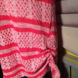 Rayon and polyester light weight stretchy sweater. This is loose fitting and will also fit an XL. Only worn once (too big). Last pic shows ruching on the sides