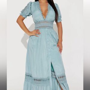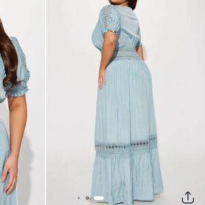 Elegant light blue maxi dress with intricate detailing. Perfect for any occasion.