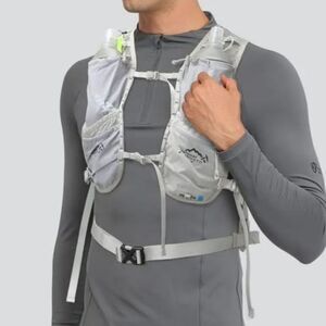 Light gray hiking backpack with multiple compartments and mesh details. Ideal for outdoor adventures.,