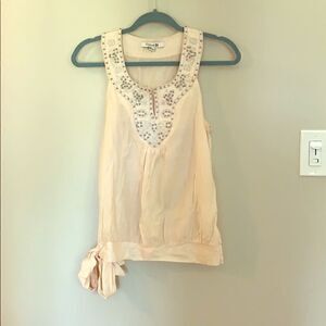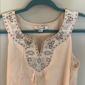 Beautiful embroidered and beaded neckline. Cinches at the bottom with tie and elastic waist in the back.