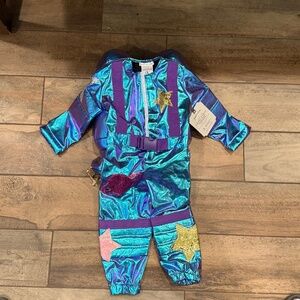 Jet packs strap to back of jumpsuit with Velcro and features 12 shooting stars at bottom of packs.