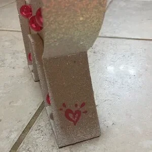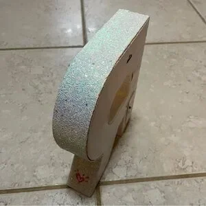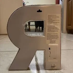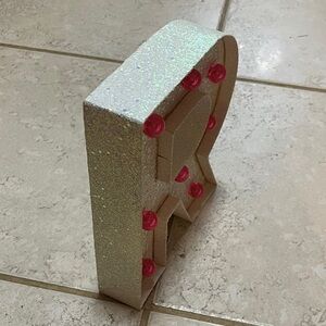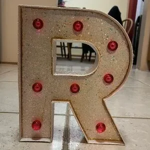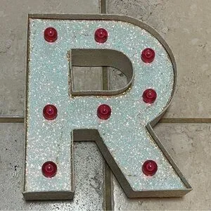White glitter letter 'R' that lights up a bright pink color. Battery powered (AAA) with on/off switch on the back. Gently used and in excellent condition! The original purchase price was $16.90.