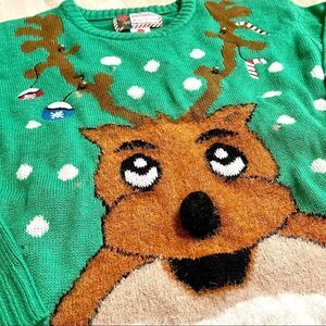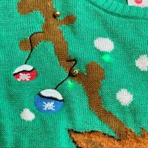 Light Up Ugly Christmas Sweater is perfect for your Christmas party! Fuzzy reindeer with pom-pom nose. Lights are controlled on interior. Small controller has pocket for comfort and ease of use. Front of sweater on the inside is lined with fleece. Unisex. Great for the holiday office party!