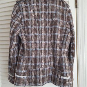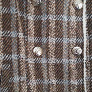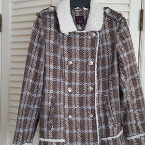 Pre-owned. In Very Good Condition. Worn once or twice. Junior's Material Girl Plaid light-weight coat, faux fur collar. Outer: Polyester 61% ,4% Wool, 29% Acrylic 6% Other. Dry Clean. Size Large -** I wear a women's medium and this coat fits great! Jacket is brown/white/blue/rose plaid tweed. Double breasted coat with silver embossed buttons. Two Front Pockets. Sleeves have zippers from the wrist halfway up to the elbow. See Photos.