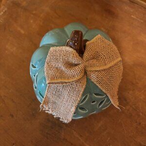Just in time for Autumn is this teal colored pumpkin. It stands 7.5" tall and is 20" round. Clean and flawless in condition. It takes 2 LR44 batteries (not included). Perfect for your fall decor.