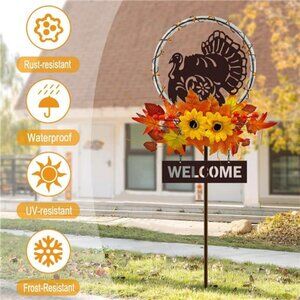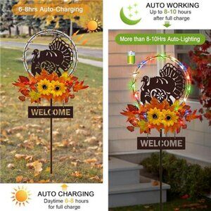 Enhance your outdoor space with this charming solar-powered turkey yard sign,featuring a rustic silhouette design with sunflowers and a welcoming message.Perfect for Thanksgiving,fall,or farmhouse decor,it adds festive charm to your porch, patio,or garden.