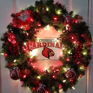 22" lighted U of L Christmas wreath with red and white glass ornaments, bow and Cards placard.
