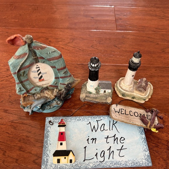 Charming lighthouse decor set featuring two small light houses, photo frame ( see pic other side is a mirror), and two nautical signs. Perfect for coastal-themed spaces.