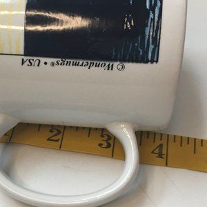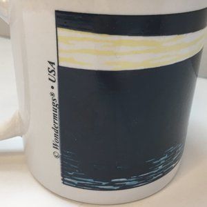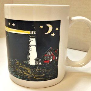 Silver Phoenix coffee mug featuring a wrap-around graphic of a lighthouse shining across the water under a moonlit sky. Gently used.
