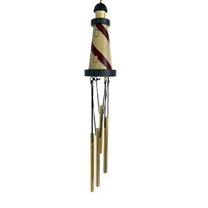 Hand-painted lighthouse wind chime featuring brass tubes. Adds a touch of nautical charm to outdoor spaces with soothing melodic tones.