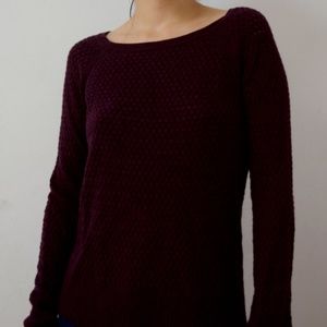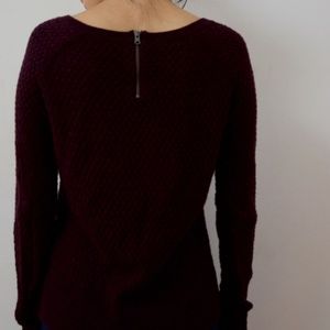 Lightly Used Knit Burgundy/Purple Sweater with zipper detailing in the back and weaved pattern across the textile. Please message for more accurate color photos or detailed shots of weaving.
