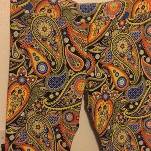 Lightly worn Lularoe leggings with a bright fun paisley pattern in blue, yellow, white, & orange.