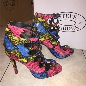 Lightly worn Steve Madden multi color snake prints heel in size 6.5. No box, worn them once, see image of the bottom.