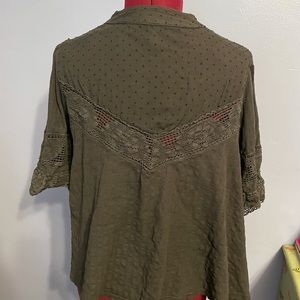 Worn twice. This blouse has lots of stretch along with pretty details. The color on the pic looks a little muted, it is more black in real life.